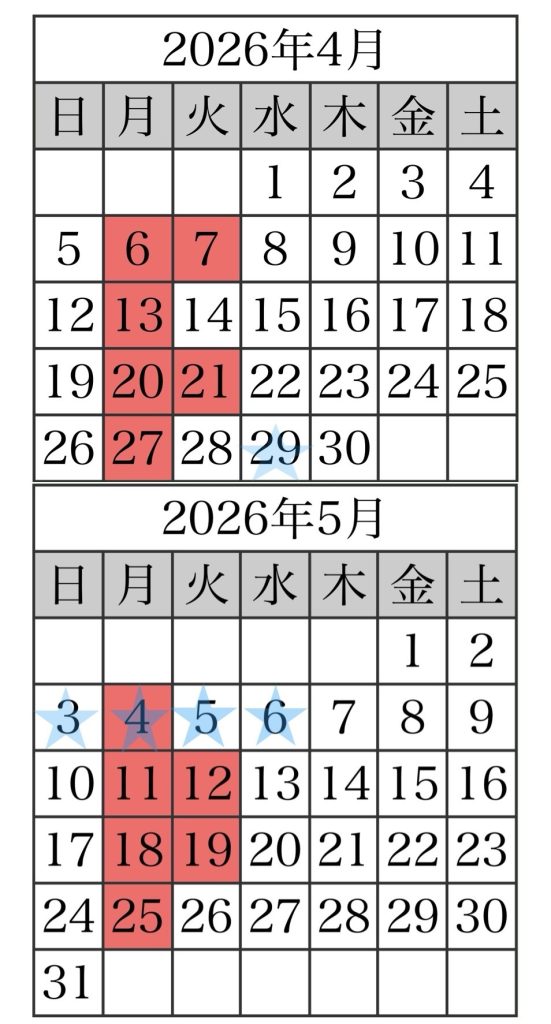 2026年3月6日 / 最終更新日 : 2026年3月6日 utage 情報 4月、5月の定休日です GW中は少し変則になりますのでお気をつけください。 赤マスがお休み、☆は祝日です。 Follow me! FacebooktwitterHatenaPocket